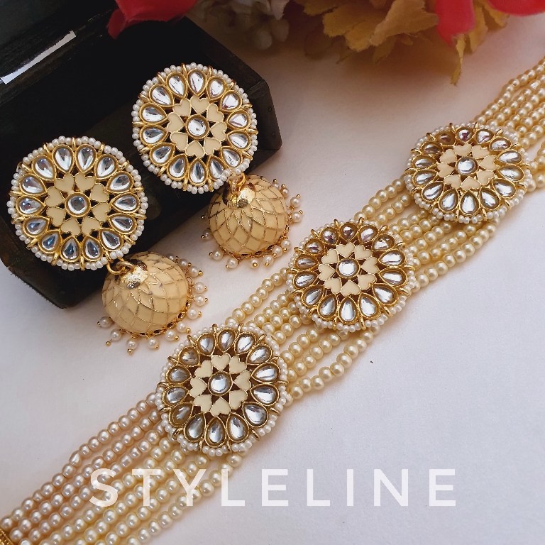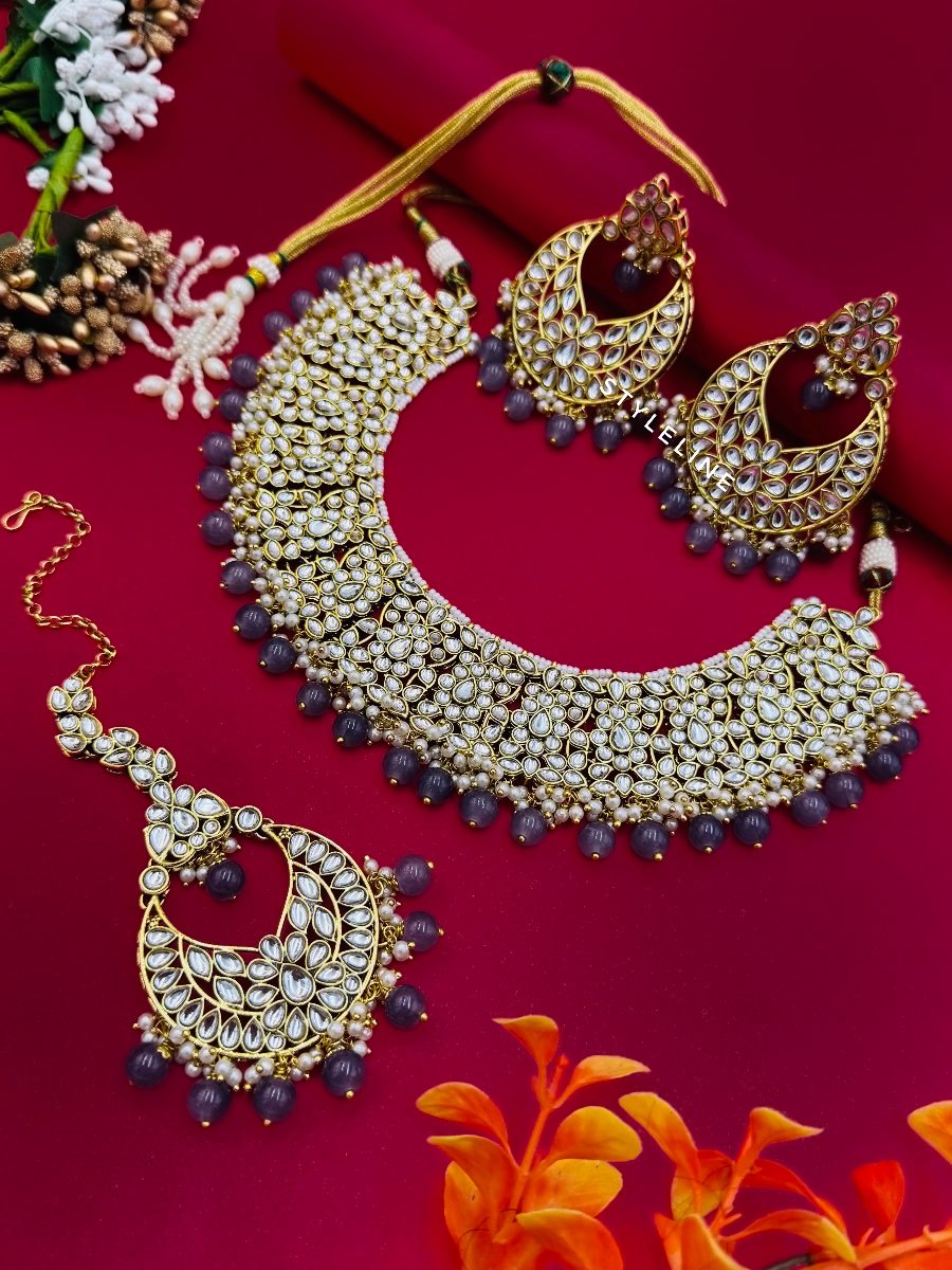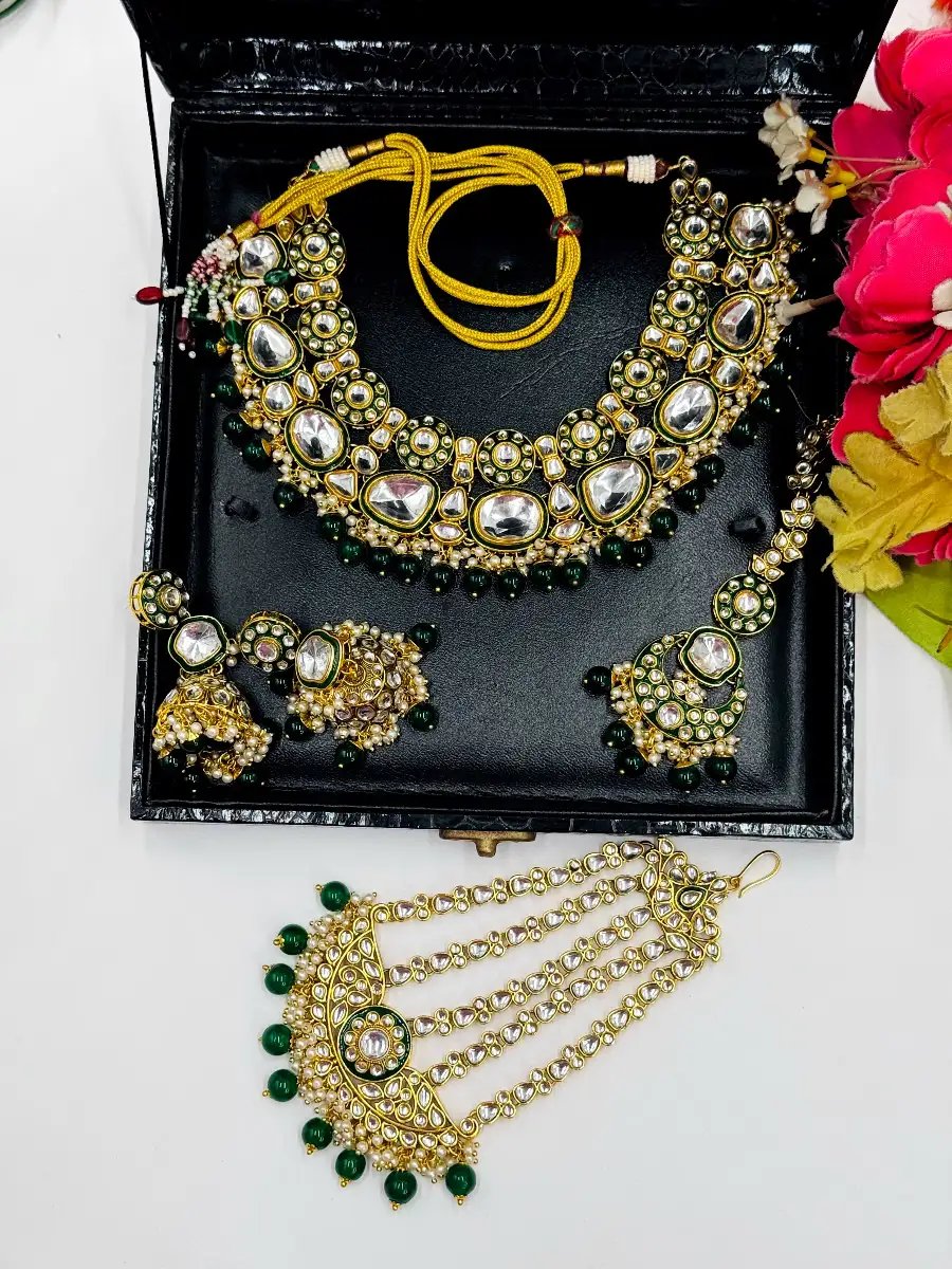 Enhance your elegance with this exquisite Jaipuri Kundan necklace set. Featuring intricate craftsmanship, the set includes a stunning choker-style necklace, adorned with high-quality Kundan stones set in gold-plated metal. Delicate beads hang gracefully along the edges, adding a touch of tradition and sophistication. Matching statement earrings and a bindiya complete the set, making it perfect for weddings, festive occasions, or special events. This necklace set captures the essence of traditional Jaipuri artistry, blending heritage with modern style. Embrace the beauty of handcrafted jewelry and elevate any ensemble with this luxurious set.