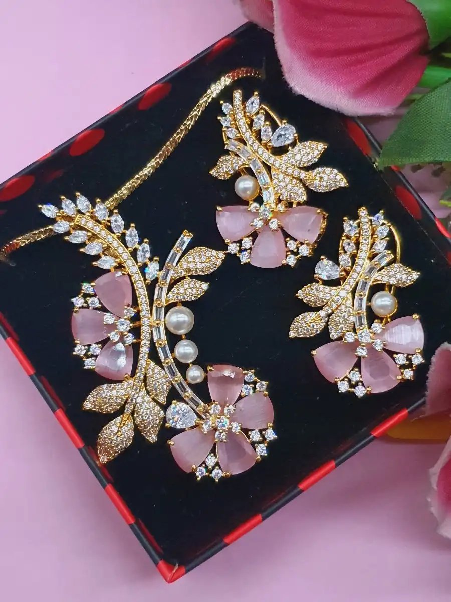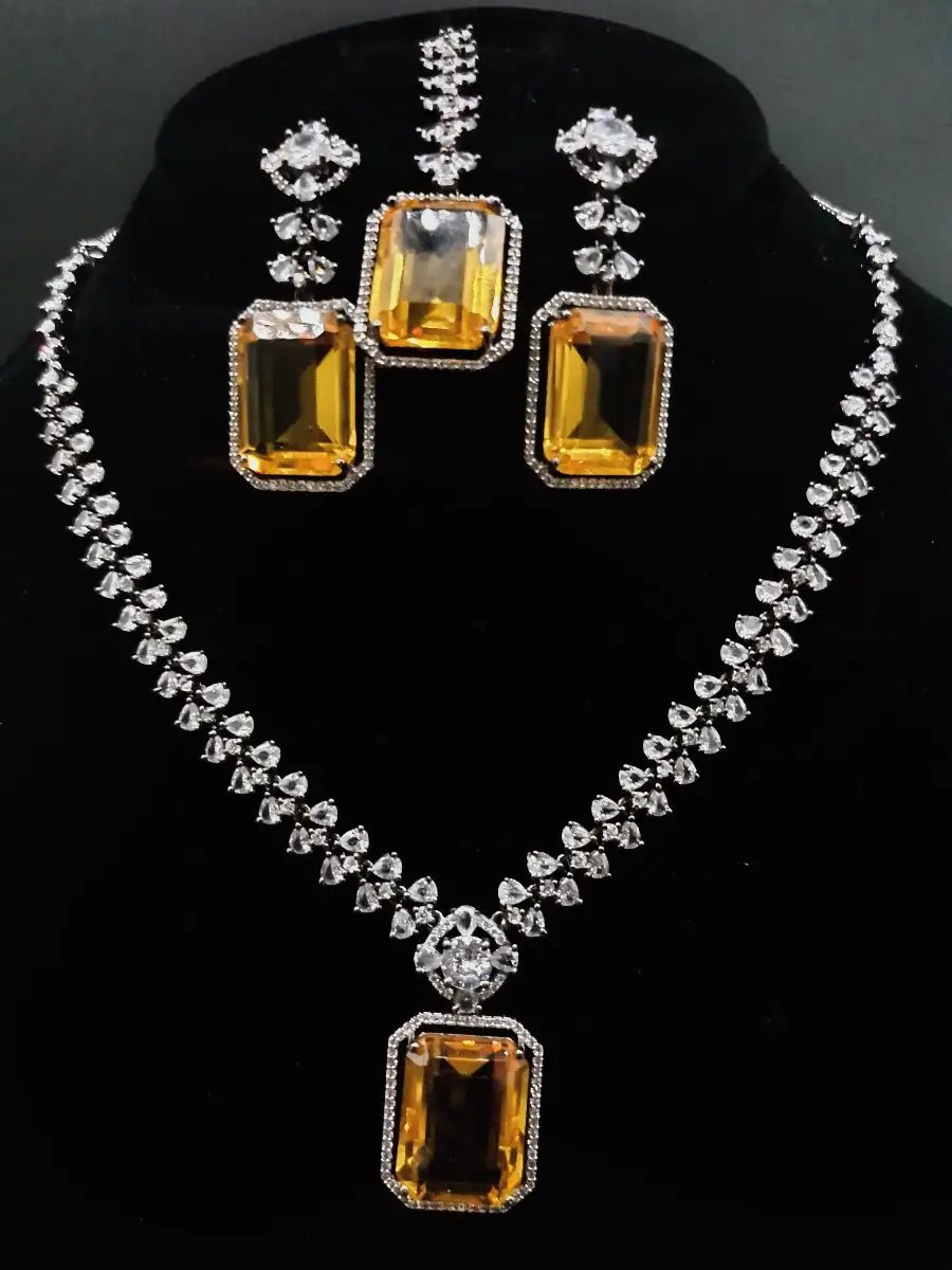 Turn heads with this stunning gold-hued zircon necklace set featuring a brilliant cut pendant, matching earrings, and a maang tikka. Ideal for weddings, parties, or festive occasions.
