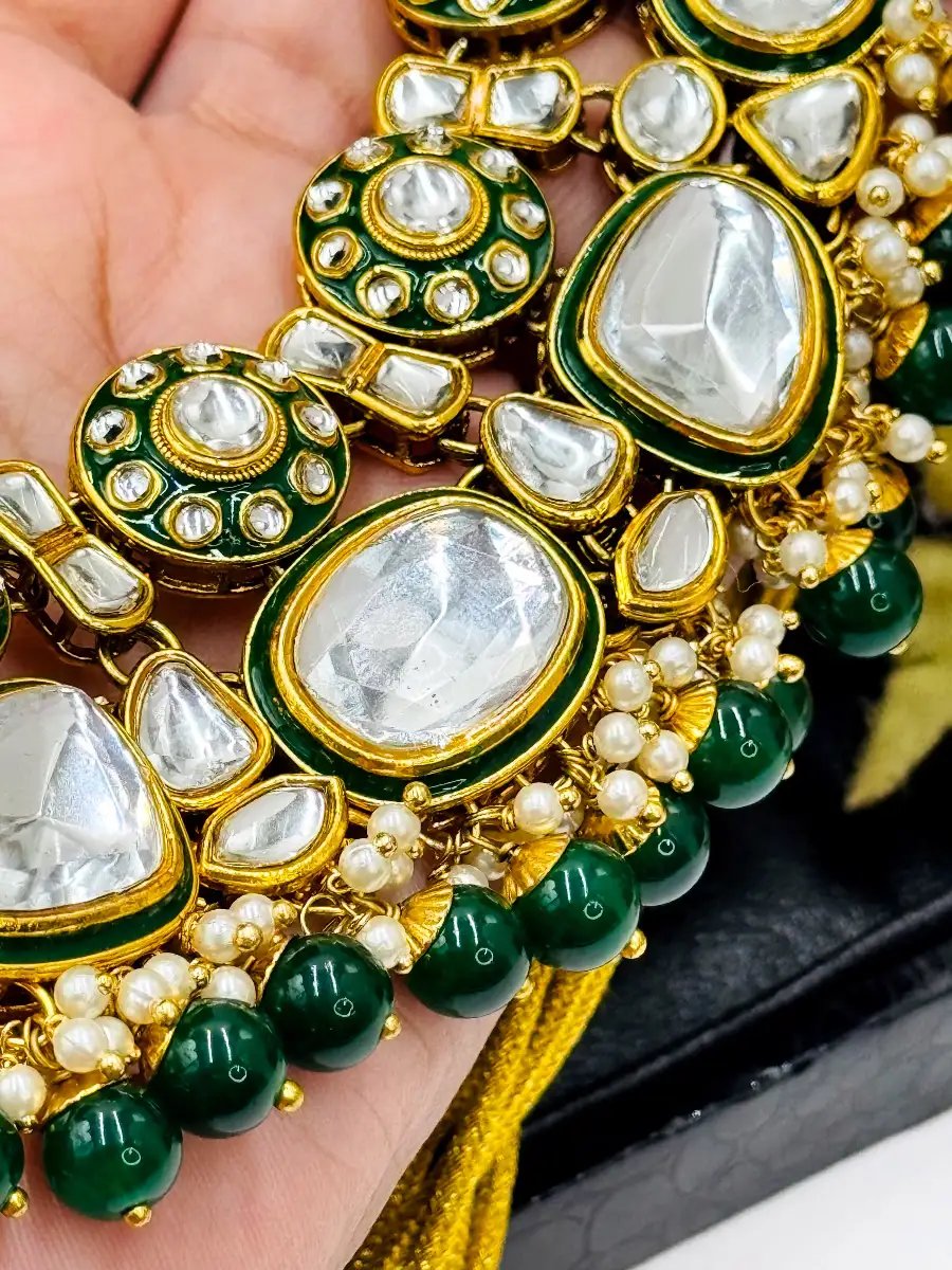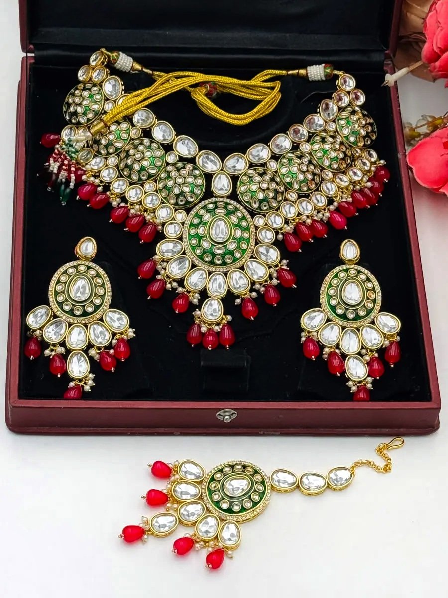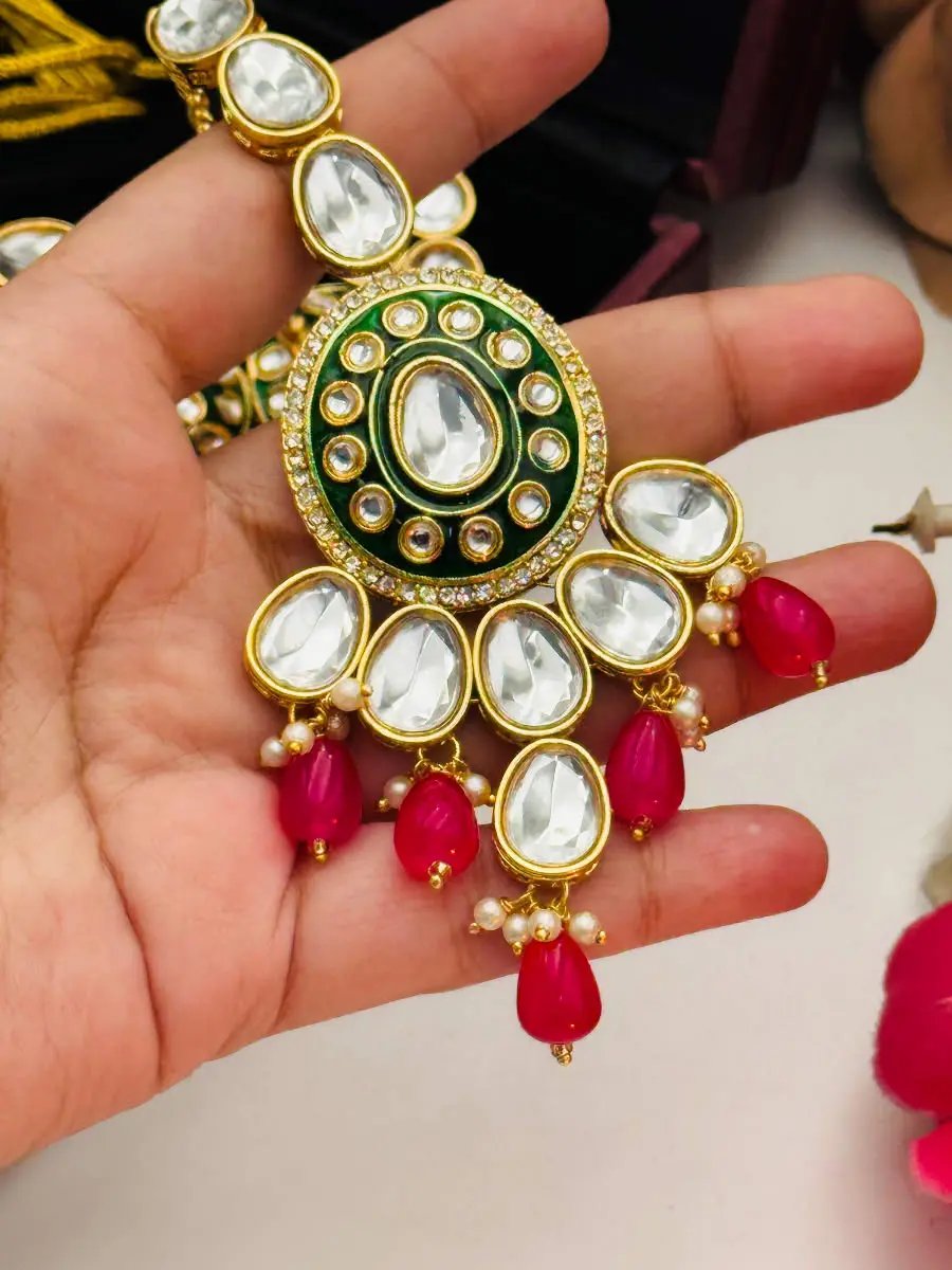 Elevate your festive look with this exquisite kundun Collar Set, featuring a stunning blend of green meenakari and hot pink stones, premium kunduni work, and elegant gold-toned detailing. This complete set includes a statement collar necklace, matching earrings, and a beautifully crafted tikka—perfect for brides, mehndi, mayoun, and festive wear.