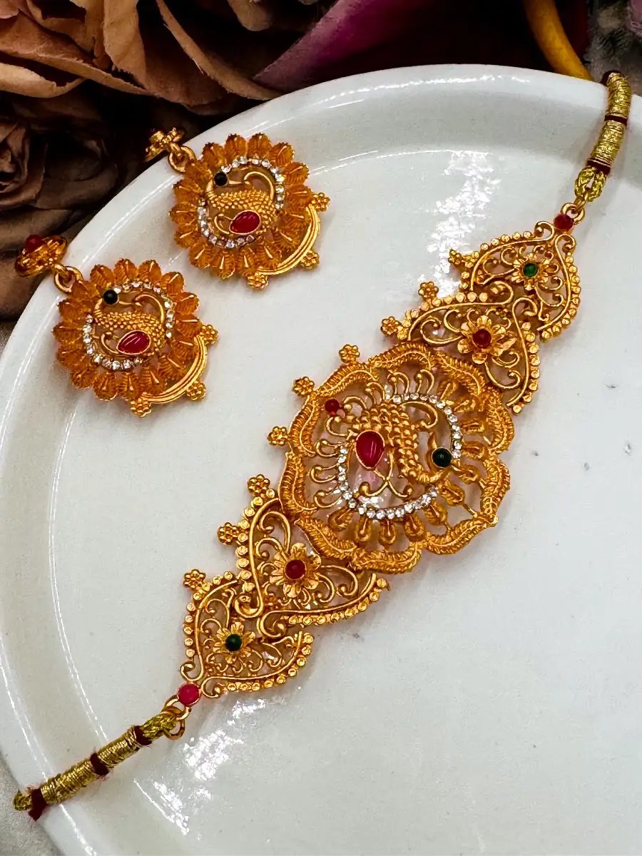 Elevate your bridal look with this stunning, intricately designed bridal jewelry set. Featuring an exquisite combination of ruby-red gemstones, golden embellishments, and pearl accents, this set exudes timeless elegance and sophistication.