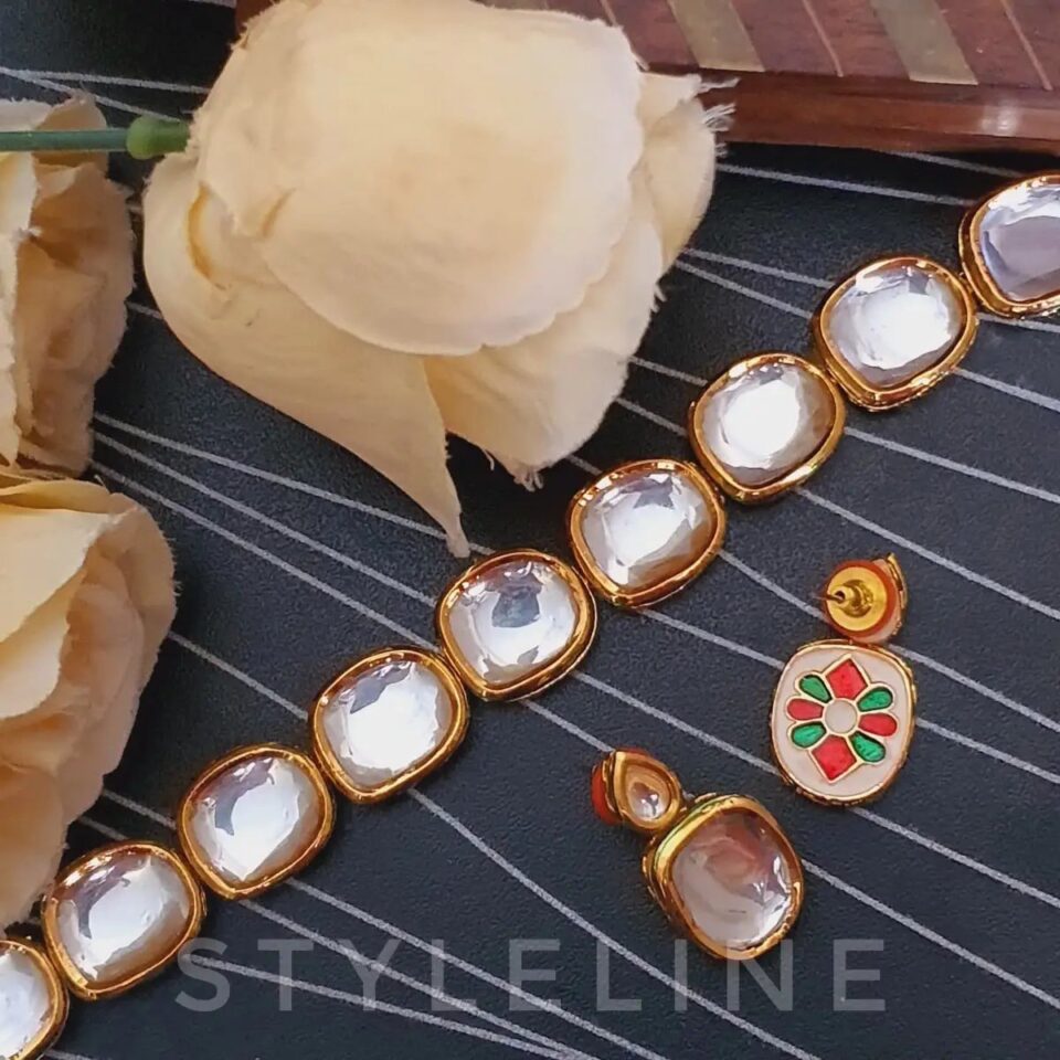 Our stylish Jaipuri kundun choker set is made with high-quality kunduns and intricate meenakari work done on the back. With this combination the set gains an extra dimension of beauty, turning it into a statement piece.