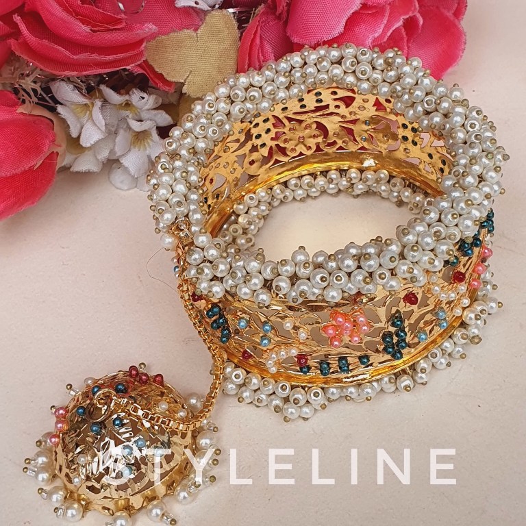 Anvi hand harness is a perfect hand piece for the timeless and elegant look. This traditional yet stylish hand harness is definitely going to steal the limelight. Engraved with mirrors and pearls on high quality brass is surely a perfect fit for a queen like you.