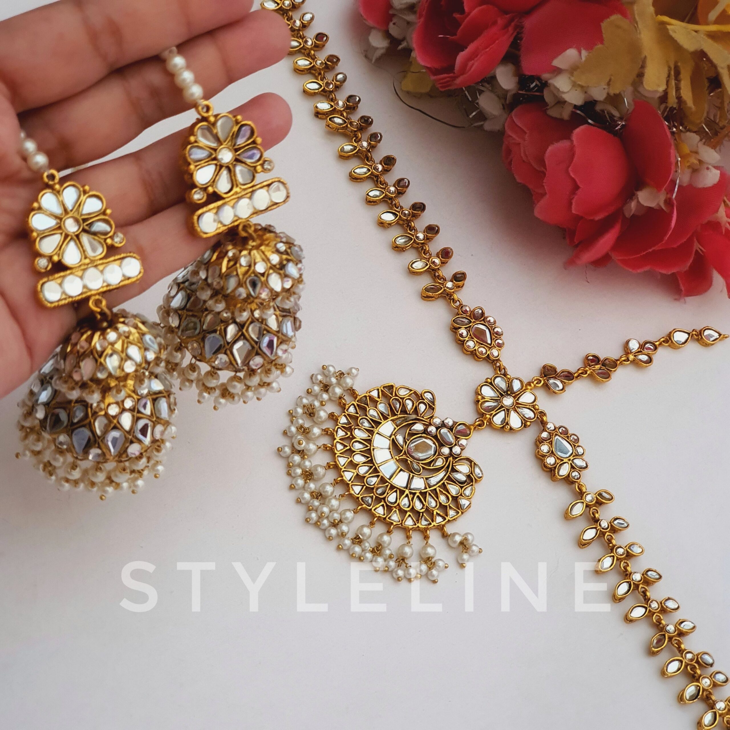 Our best-seller AYEZA headpati jhumki set in mirror work is a perfect choice for this festive season. This set is impeccably designed with captivating details. A must have for any accessory lover!