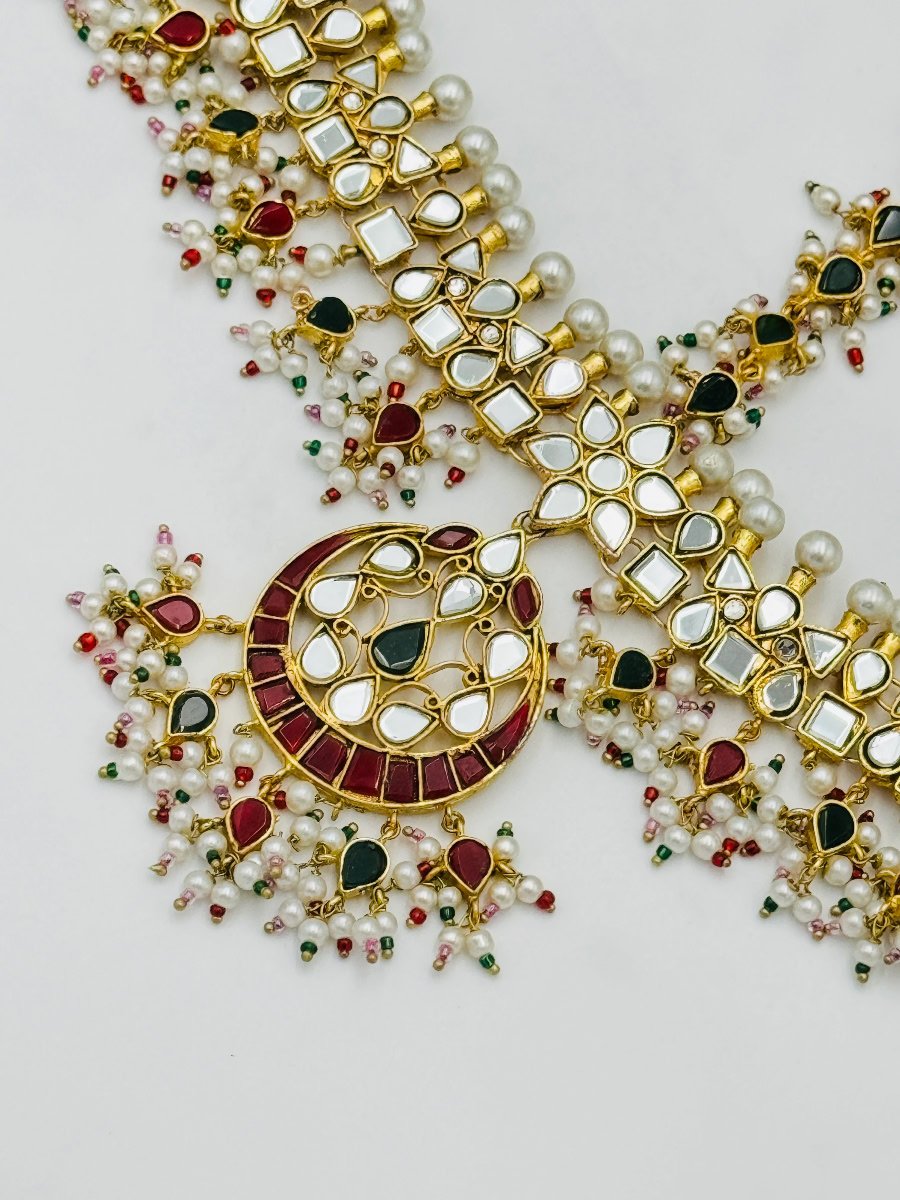 The standout feature is its detachable teeka, allowing for versatile styling options to suit your mood or occasion. The piece is embellished with lustrous pearls and finest mirror stones, beautifully blending tradition with contemporary appeal. Perfect for bridal or festive wear, this Sheeshpatti and Jhumki set is designed to make a lasting impression.
