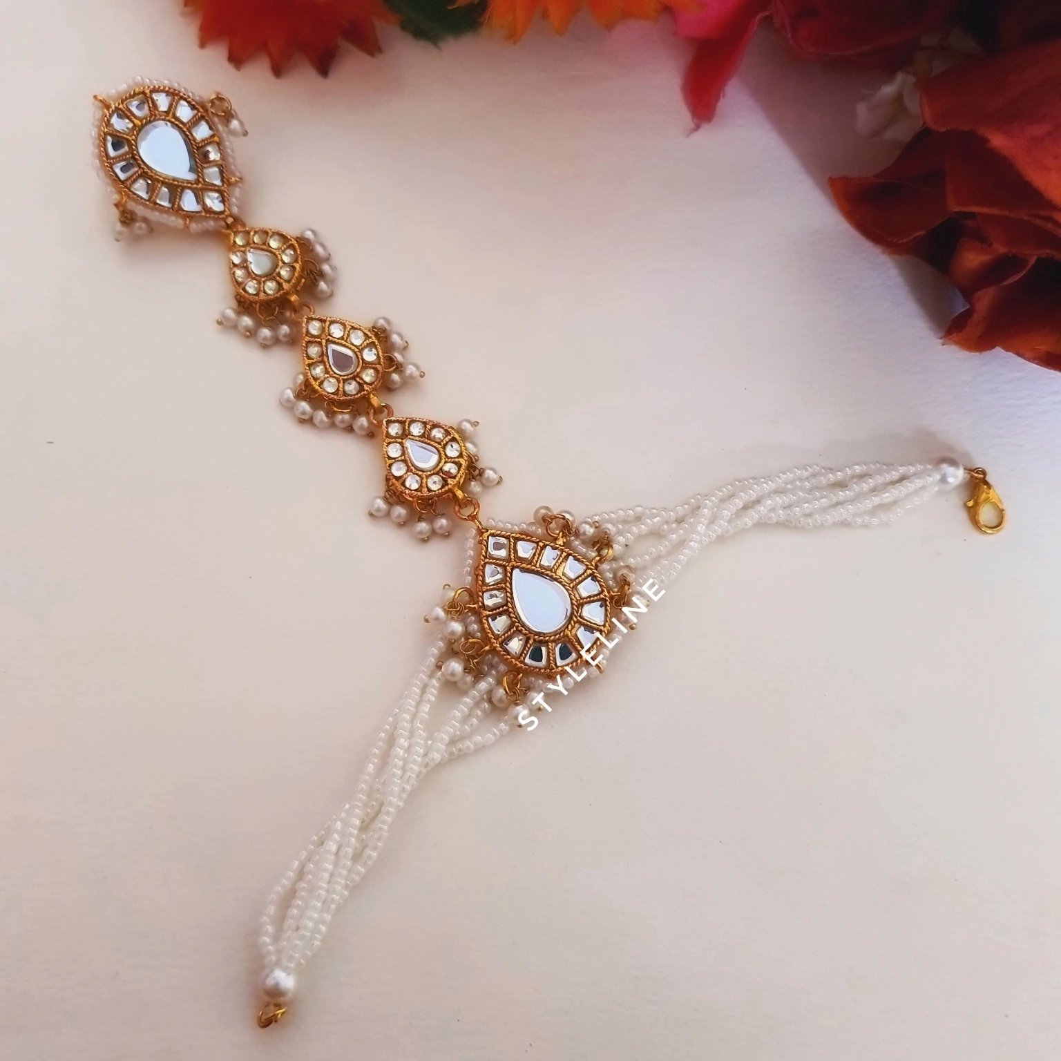 TARA hand harness is a perfect hand piece for the timeless and elegant look. This traditional yet stylish hand harness is definitely going to steal the limelight. Handmade with high quality brass and material is surely a perfect fit for a queen like you.