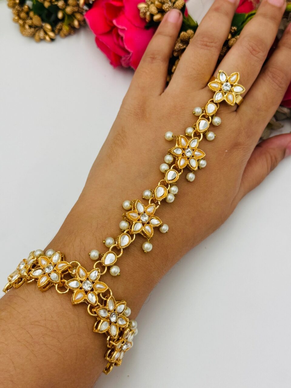 NIDHI hand harness is a perfect hand piece for the timeless and elegant look. This traditional yet stylish hand harness is definitely going to steal the limelight. Handmade with high quality brass and material is surely a perfect fit for a queen like you.